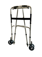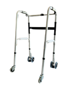 Déambulateur pliant réglable en hauteur 4 roues, dont 2 roues jumelées à rotation frictionnelle.