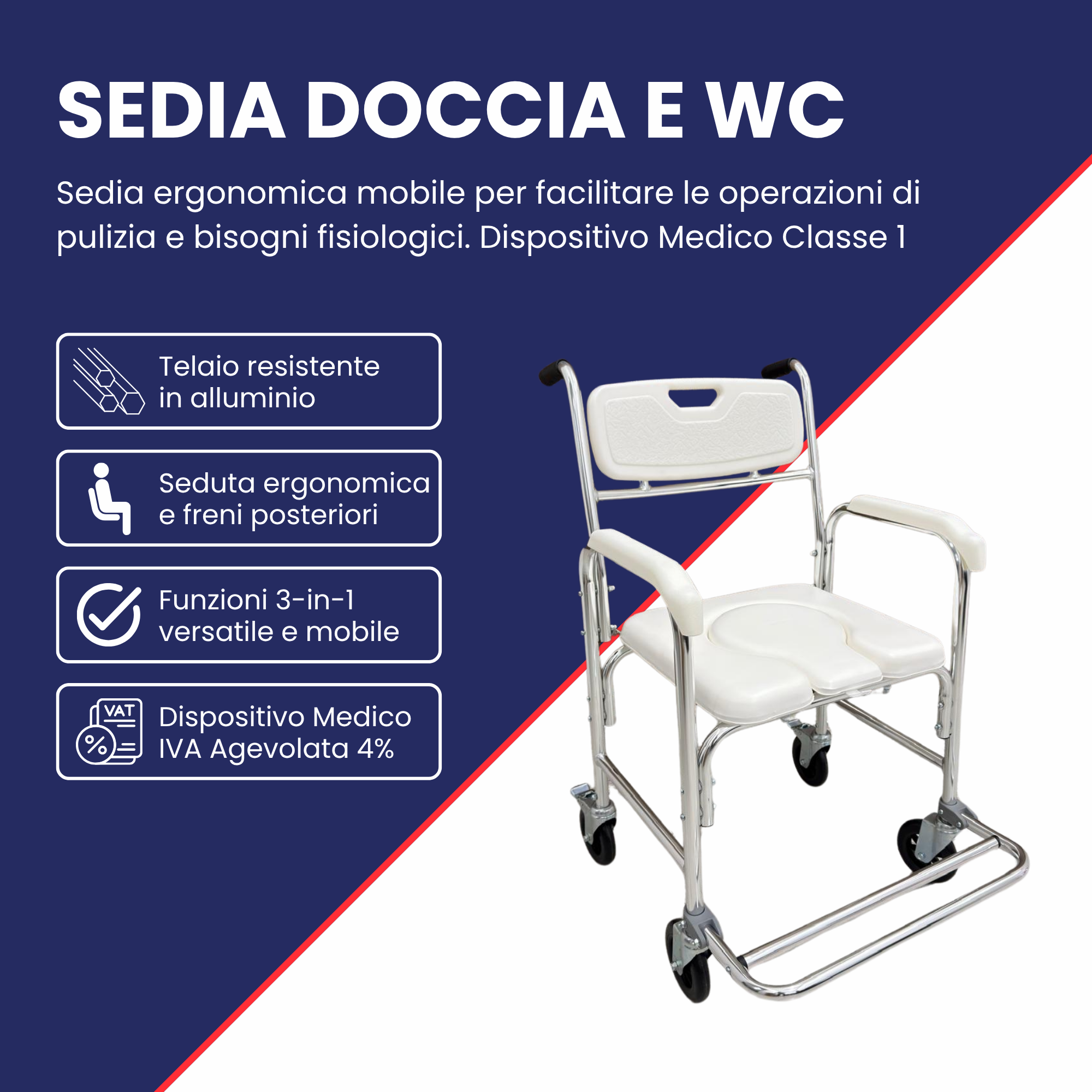 Confort, hygiène et sécurité réunis en un seul dispositif. La chaise de toilette Ferrucci Comfort avec roues è spécialement conçue pour simplifier la toilette quotidienne des personnes âgées, des personnes en situation de handicap ou à mobilité réduite. Sa structure en aluminium la rend légère et maniable, tandis que son assise anatomique rembourrée garantit un confort optimal.