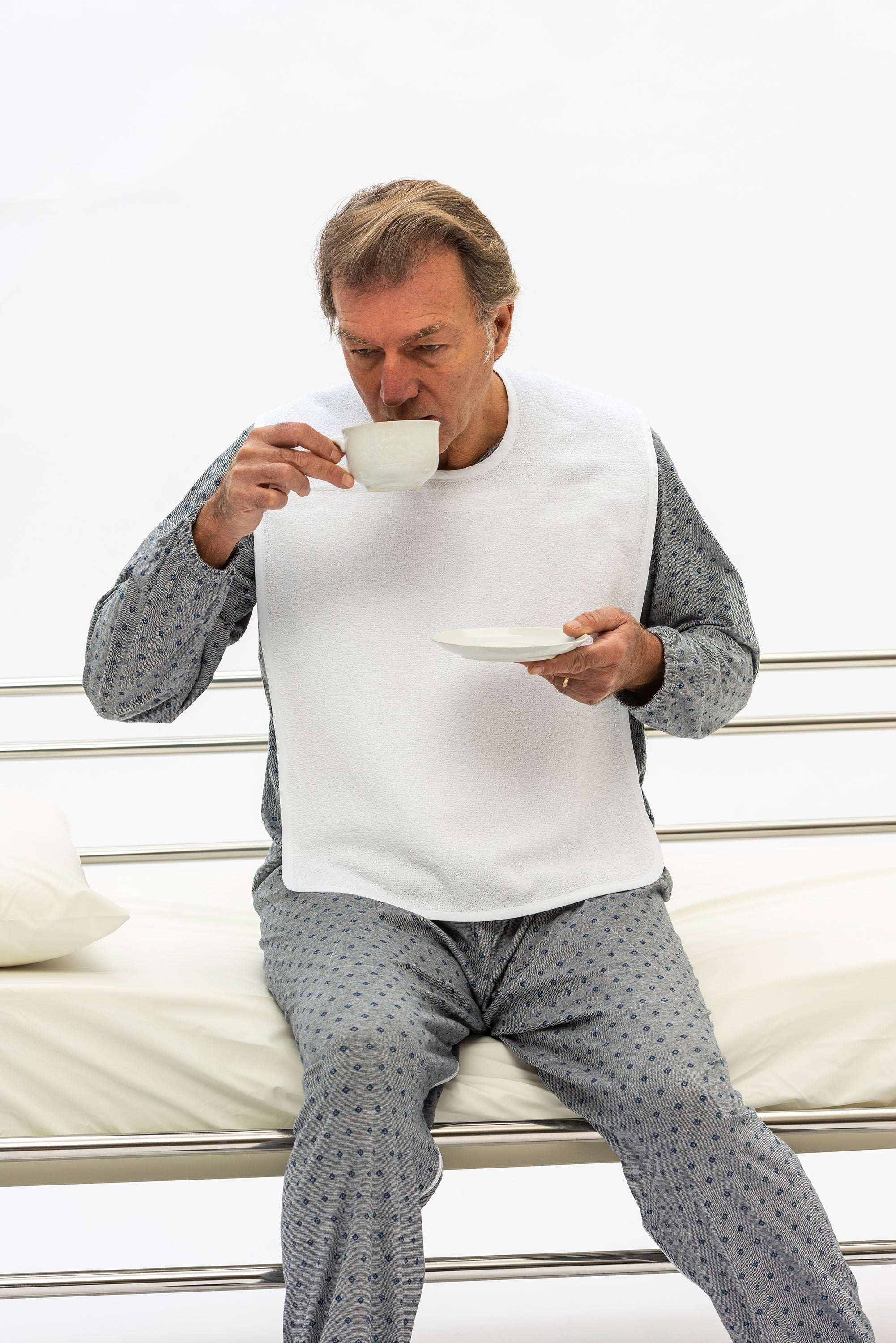 Avec ses 65 cm de longueur, il couvre parfaitement la poitrine et le ventre, offrant une protection étendue pour les repas, les soins ou les activités de la vie quotidienne.