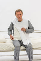 Disponible en blanc, ce bavoir pour adulte long est sobre, facile à assortir à tous les vêtements, et adapté à tous les contextes (domicile, hôpital, EHPAD).
